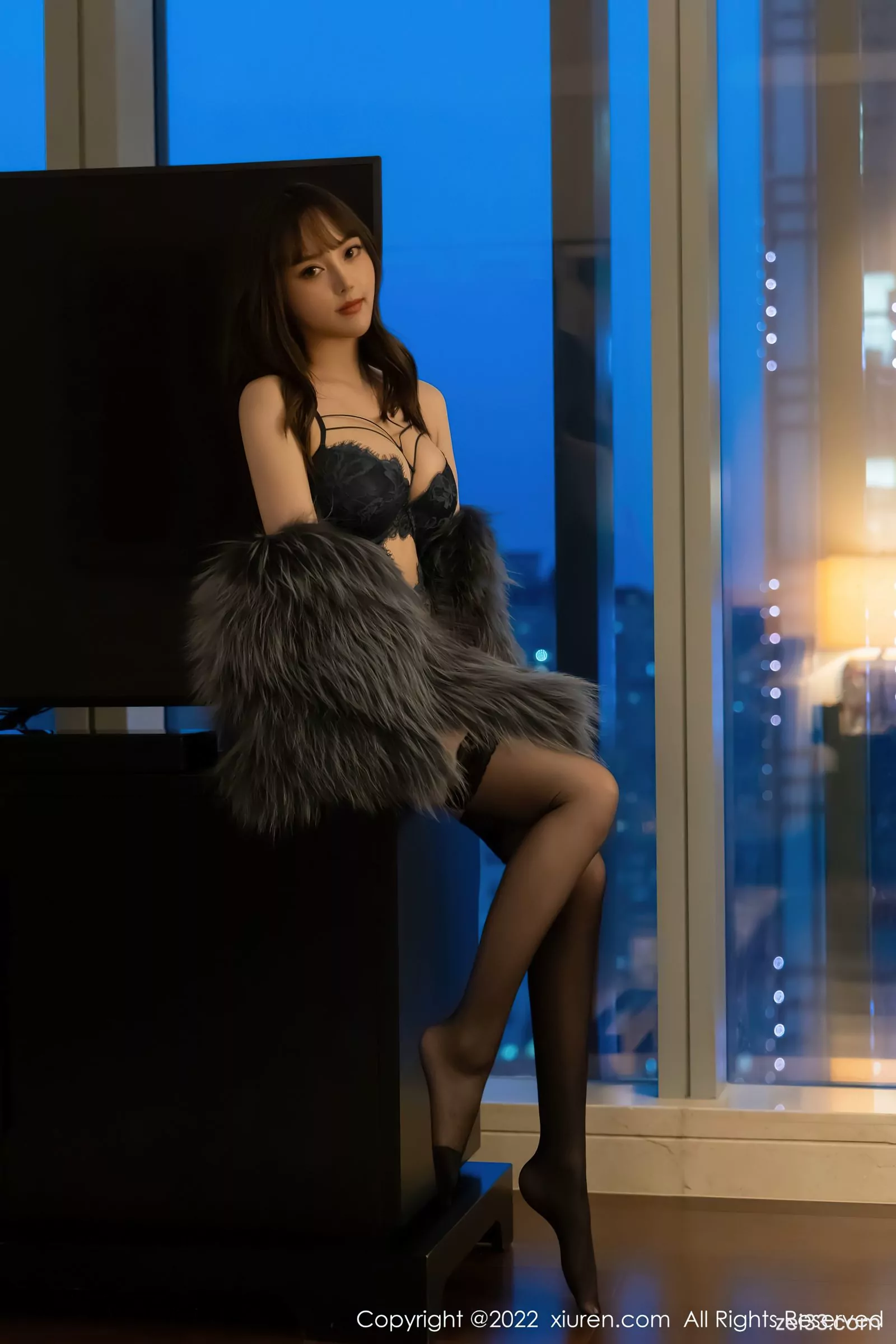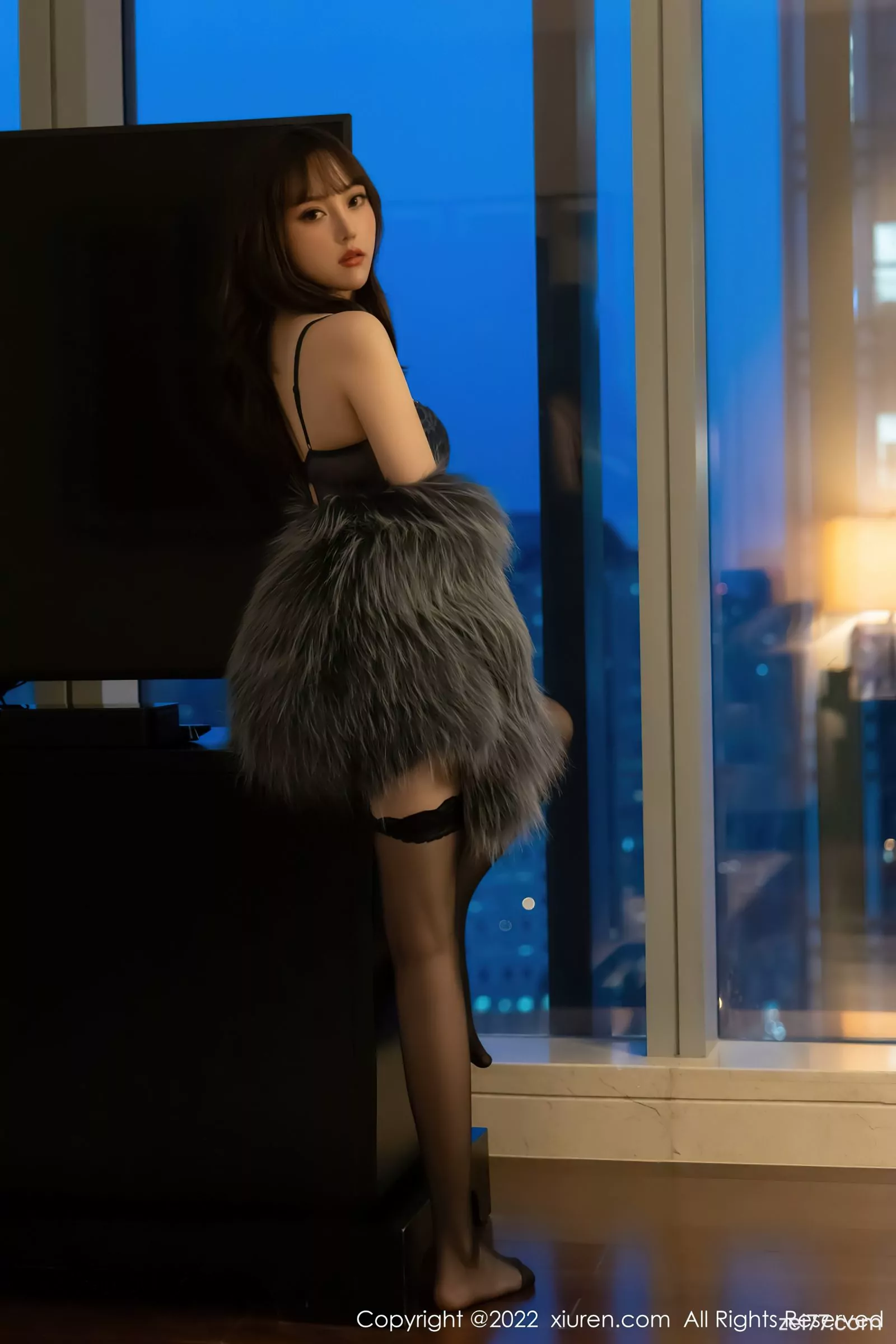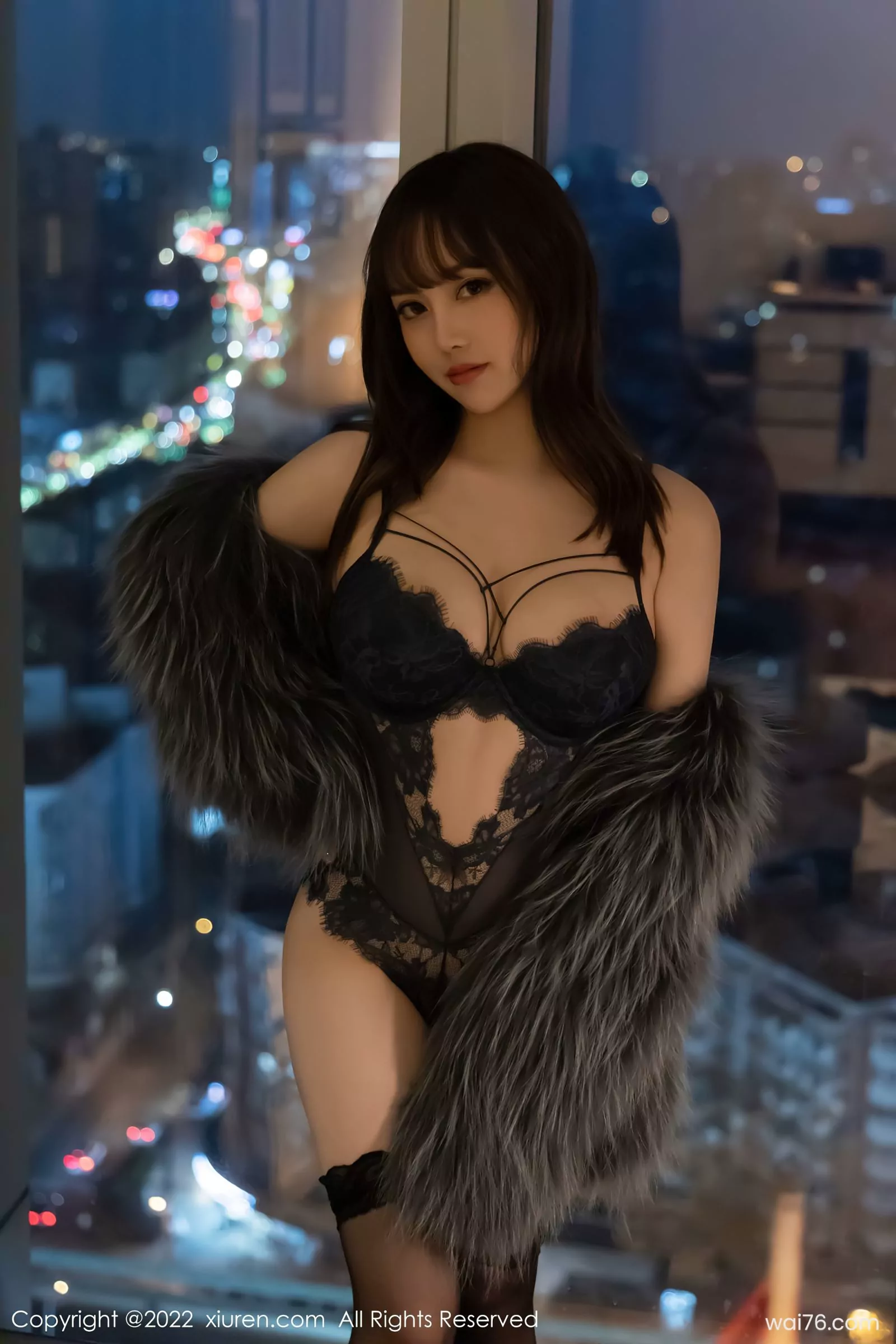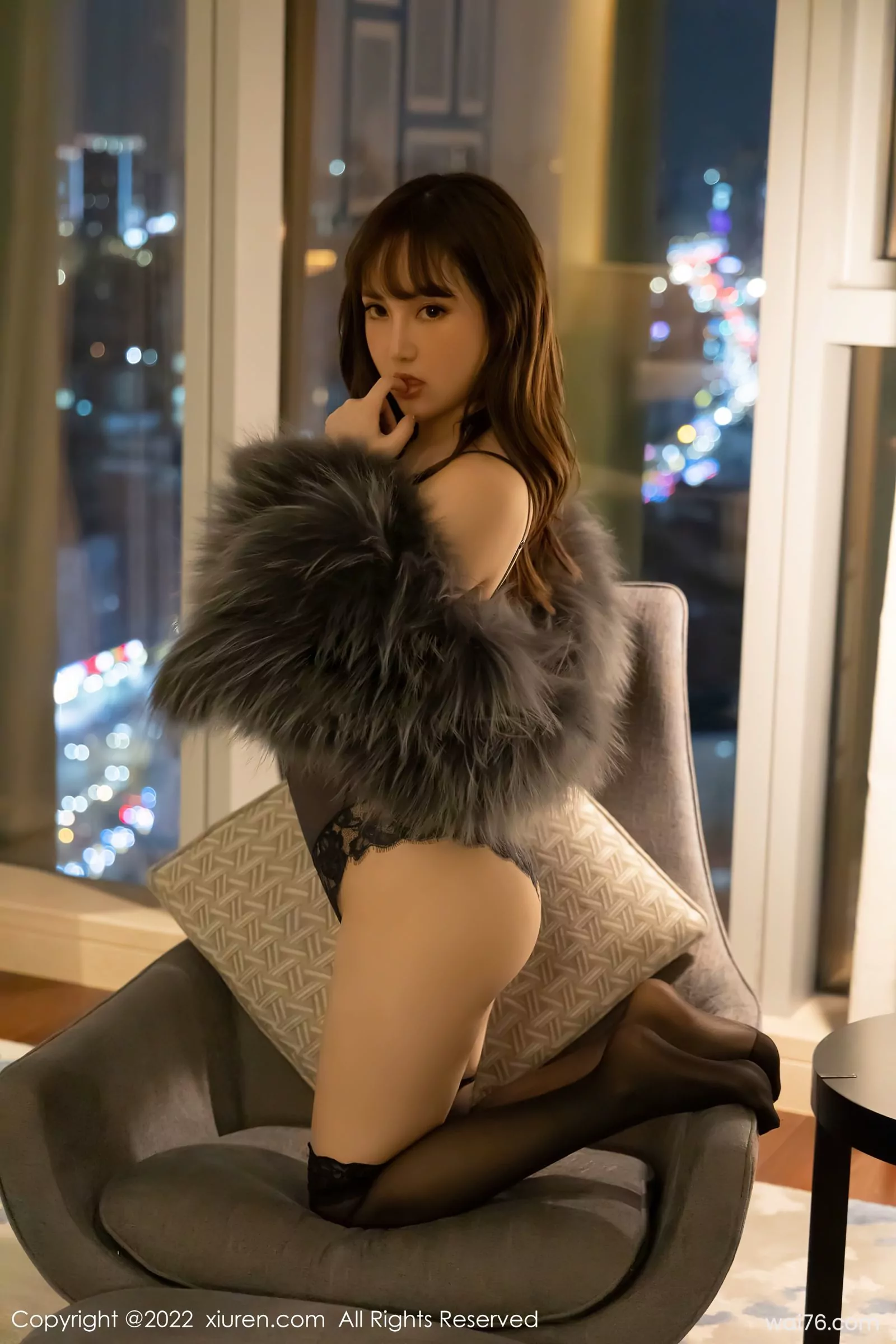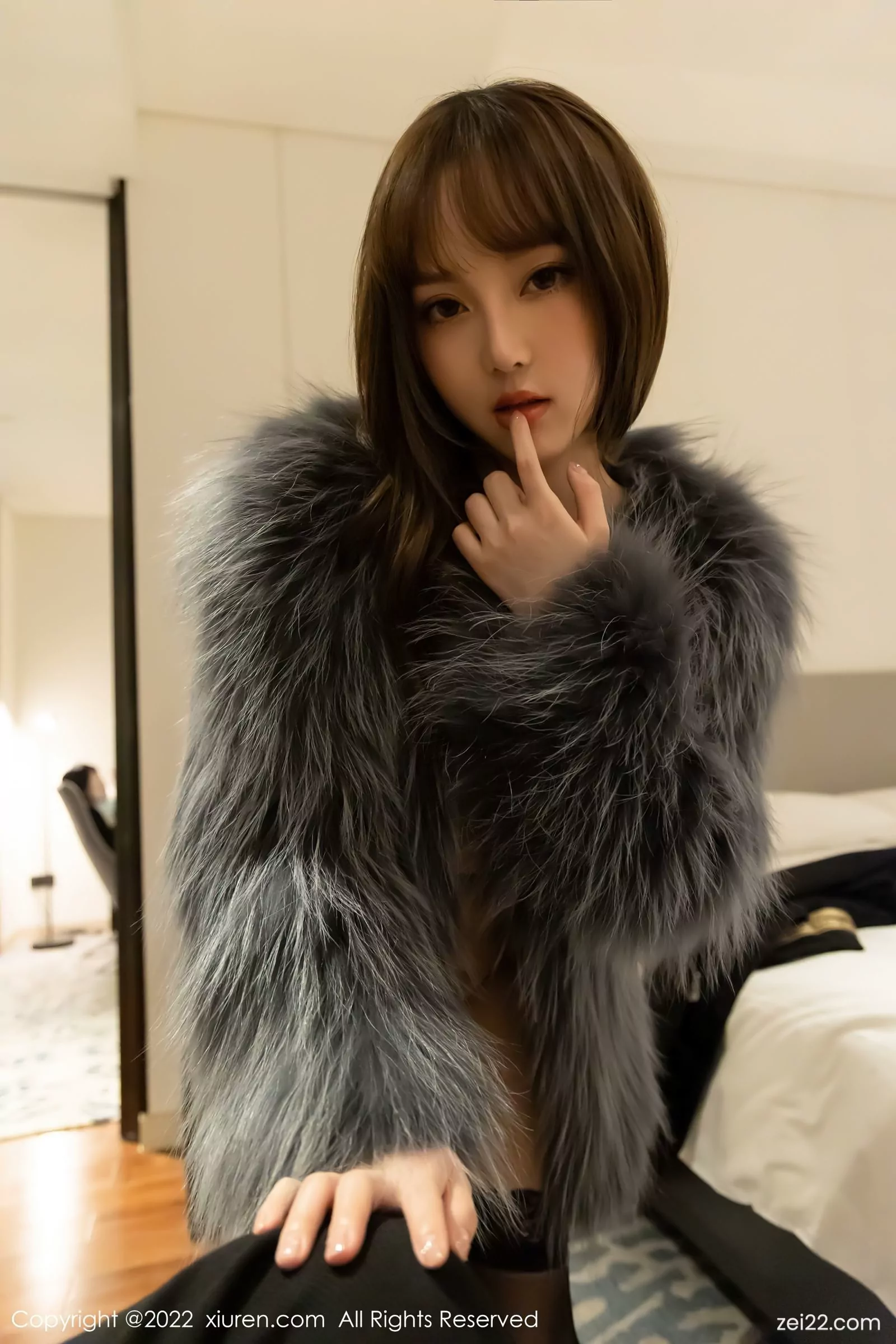 [XiuRen秀人网] No.4644 豆瓣酱 Áo khoác lông xám đen với lụa đen